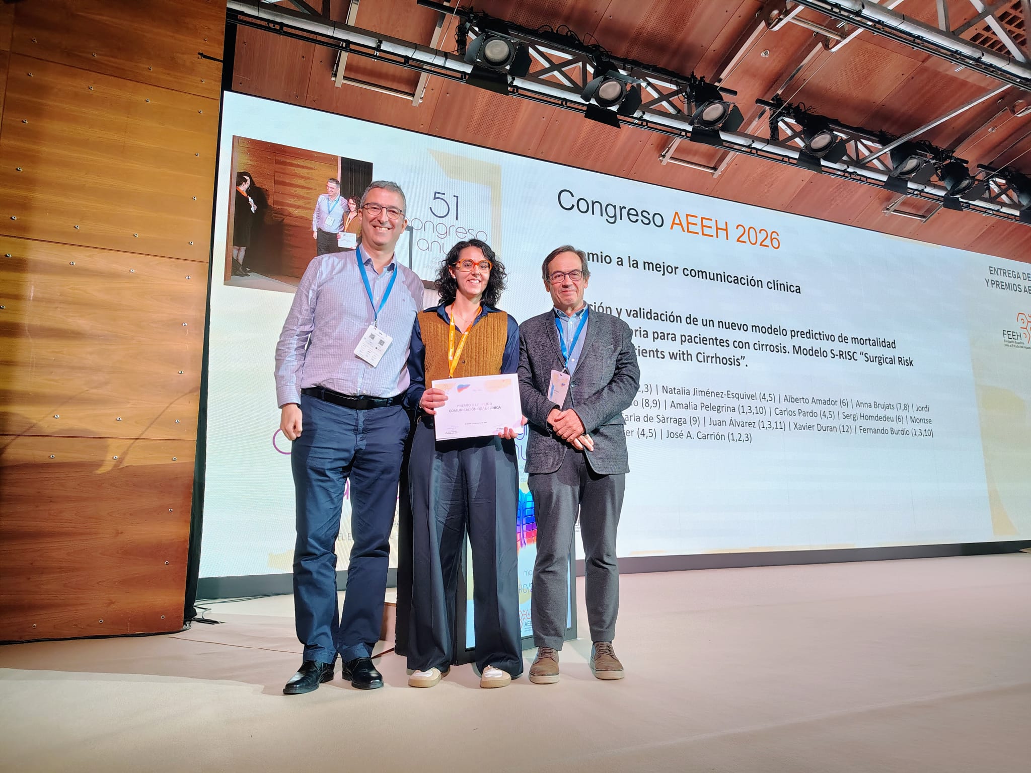 - Premio Mejor Comunicación Clínica. «Creación y validación de un nuevo modelo predictivo de mortalidad postoperatoria para pacientes con cirrosis. Modelo S-RISK Surgical Risk Score for patients with cirrhosis”. Coordina: José Antonio Carrión. Recogió el premio Lidia Canillas. Hospital del Mar.
