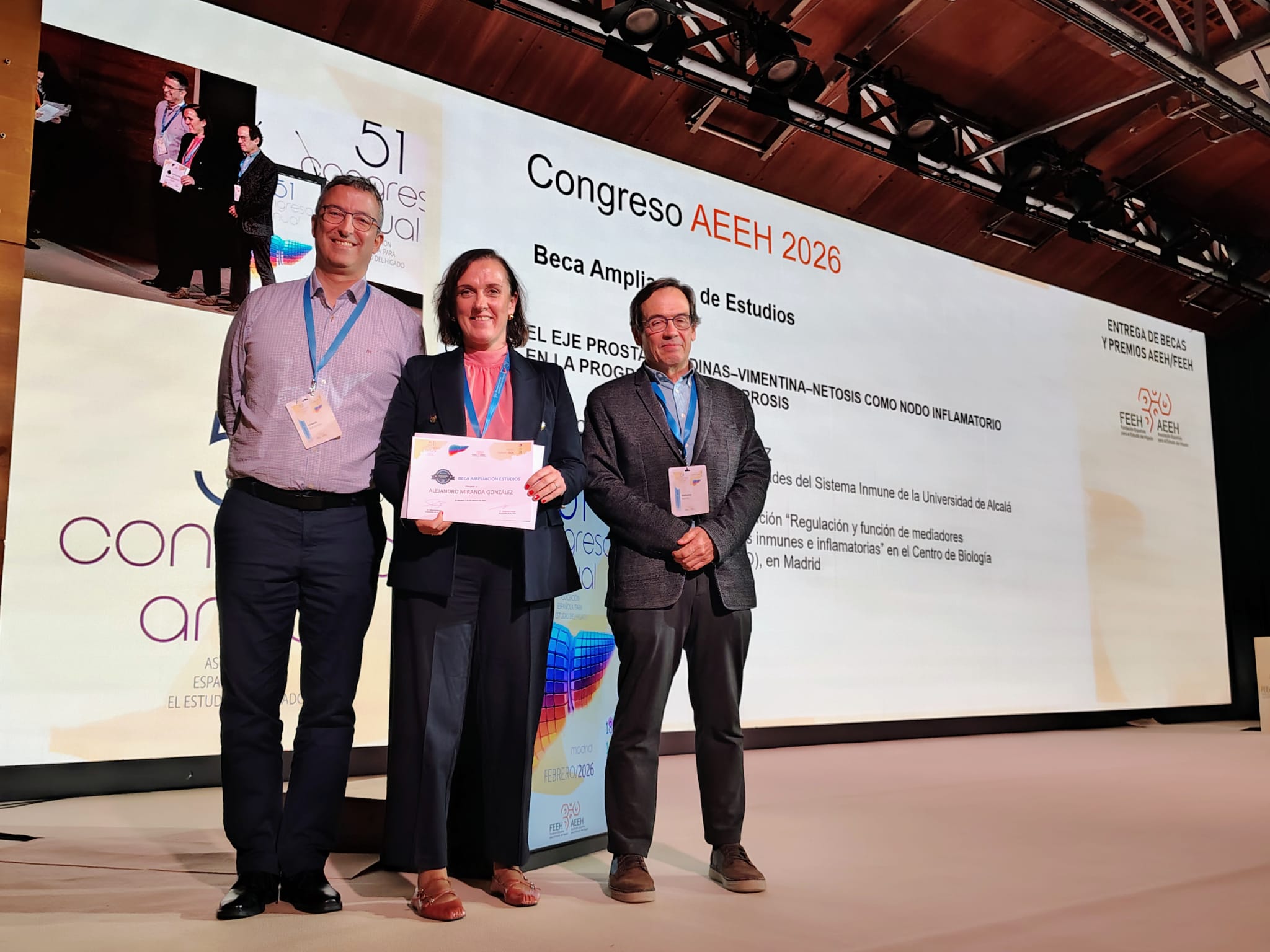 - 2ª Beca Ampliación de Estudios para Alejandro Miranda González (Universidad de Alcalá), por «El eje prostaglandinas- vimentina-netosis como nodo inflamatorio en la progresión de la cirrosis». Recogió el premio en su nombre una compañera.