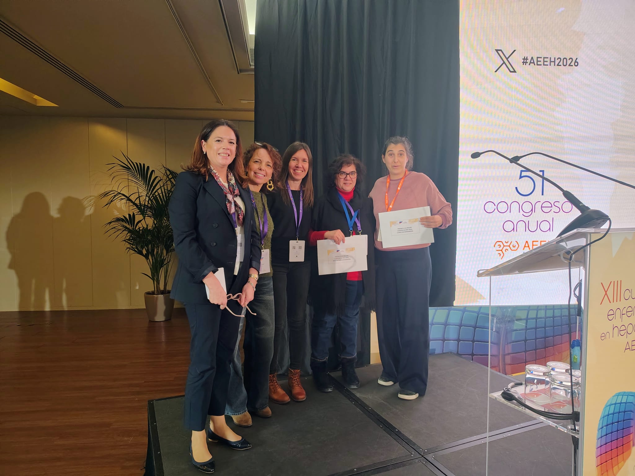 El XIII Curso de Enfermería lo hemos celebrado en un salón más grande porque ha crecido en nº de asistentes (más de 80 inscritos) e incluyó algunos anuncios relevantes: el lanzamiento de la próxima Guía de Cuidados para la persona con EHA, elaborada por el grupo de Enfermeras; y los premios a la Mejor Comunicación Oral (votada por asistentes) para Carmen Cors, y la Mejor Comunicación Oral presentada con resultados (votada por el Cte. ccfico.) para Esther Palacios. También nos dejó dos momentos muy emotivos: el premio a la Mejor Trayectoria Profesional de las enfermeras para Eva Pérez Bech (ex presidenta de FNETh fallecida en 2025) y la cariñosa despedida de Eva Román como coordinadora, pasándole el testigo a Anna Miralpeix, que estará al frente del grupo junto a Amaya Redín. ¡Gracias Eva por tu trabajo!